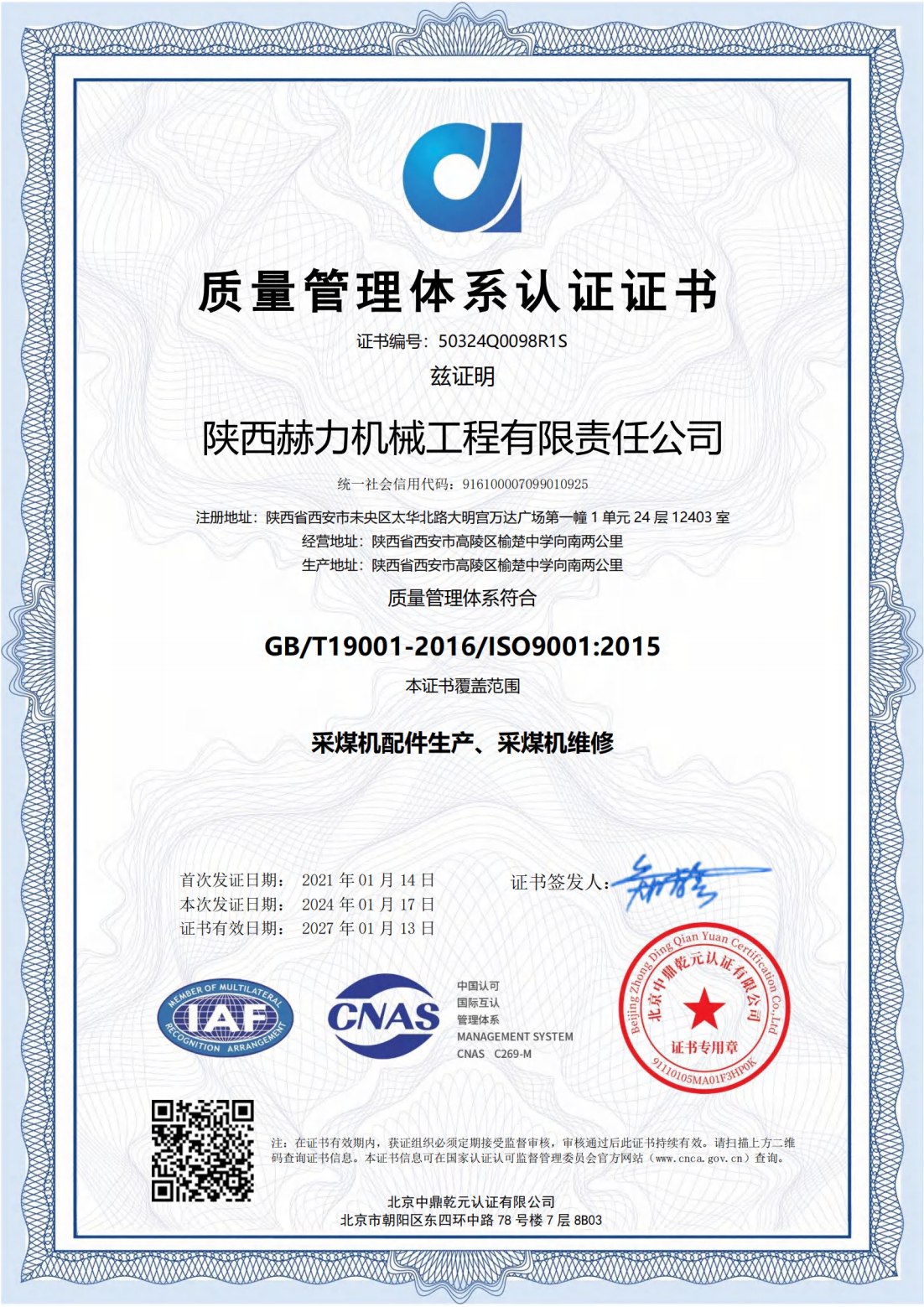 質(zhì)量管理體系認證證書