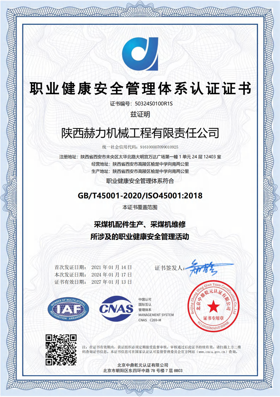 職業(yè)健康安全管理體系認證證書